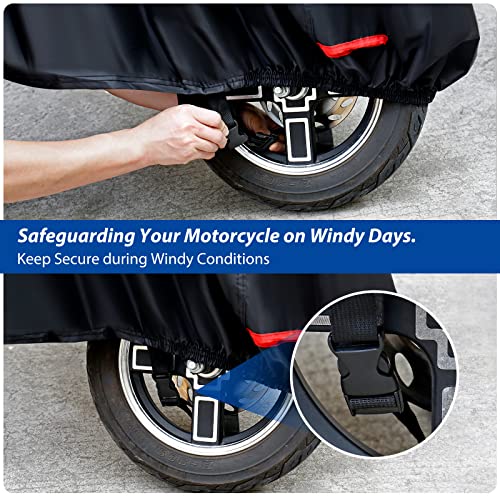 【Meilleure Protectrice Pour Votre Moto】Conception Antivol: Cette housse de motocyclette sécurisée est munie d’un trou de serrure qui facilite l’utilisation du verrou de la moto lorsque vous le fixez avec une serrure. En outre, le couvre-moto Ezfull possède un fond élastique et une sangle fixe avec boucle à l’arrière pour resserrer la moto afin que le capot de protection ne soit pas emporté par le vent.